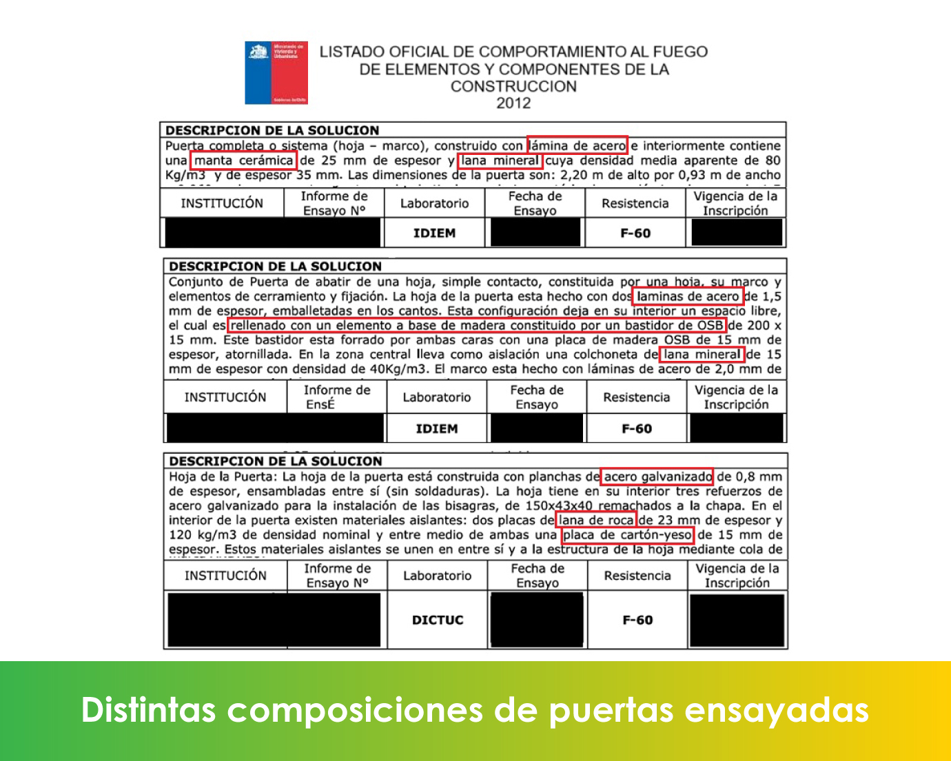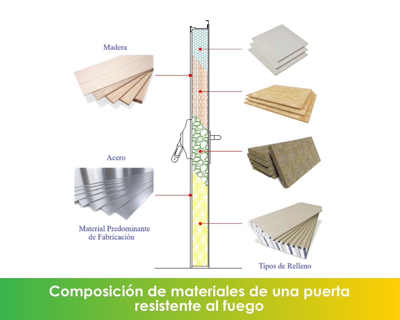 En cuanto a los rellenos, que contribuyen al buen desempeño de la puerta, no existe una regla que establezca qué materiales deben utilizarse. Sin embargo, deben priorizar el aislamiento térmico de la hoja frente a la exposición al calor, para reducir la irradiación hacia el lado protegido y evitar, además, la generación de gases inflamables y su ingreso a las zonas protegidas.