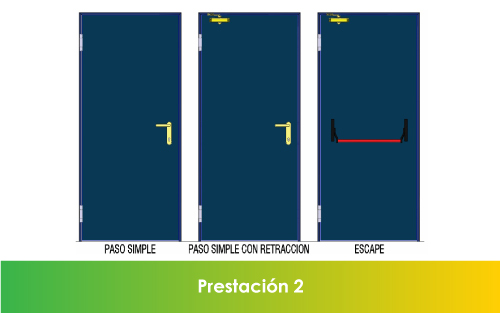 Dentro de nuestra legislación, se describen y detallan puertas resistentes al fuego con ciertos mecanismos en su composición, lo que determina una “Prestación” específica de forma tácita. La O.G.U.C indica en los artículos 4.2.28, 4.3.7 punto 4 y 4.3.14, que este tipo de puerta está destinada a zonas básicamente de evacuación, dándole entonces la prestación de puerta de “Escape”, lo que se deduce por los mecanismos señalados, como el grupo de herrajes a considerar.